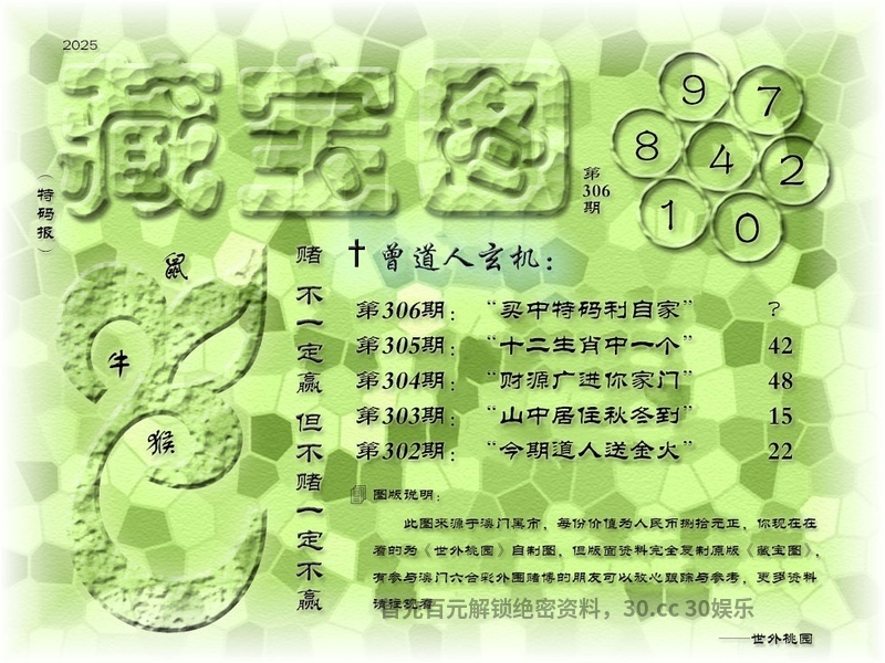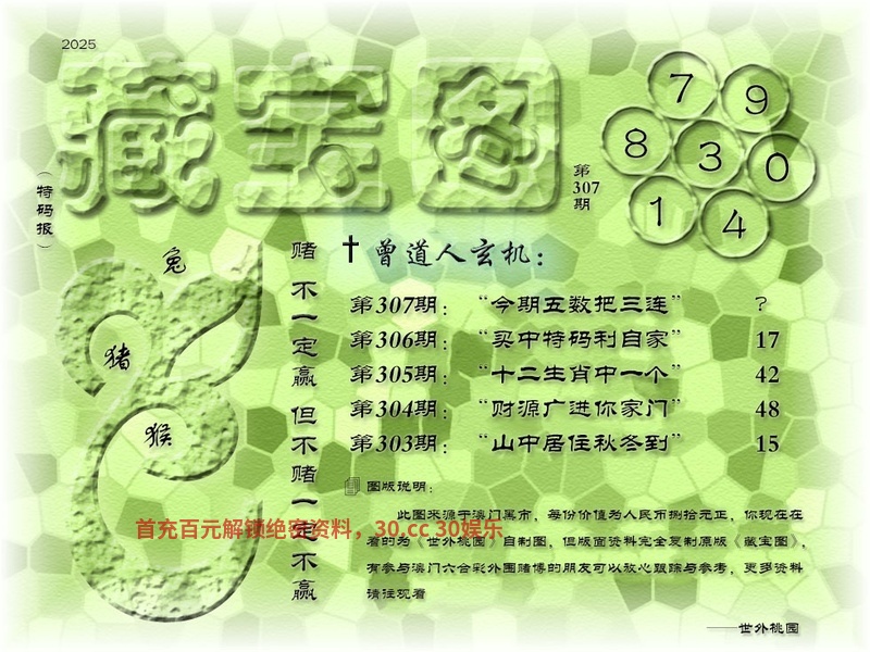| 307期:今期五数把三连 解释:今期五数把三连,五数三连,解单肖猪羊兔蛇牛鸡 藏宝九肖:猪羊兔蛇牛鸡狗鼠猴 |