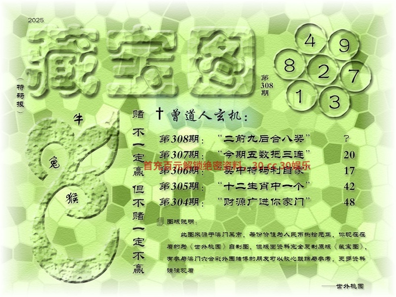 | 304期:九肖 | 龙蛇马猪虎牛狗羊兔 | 马48中 |